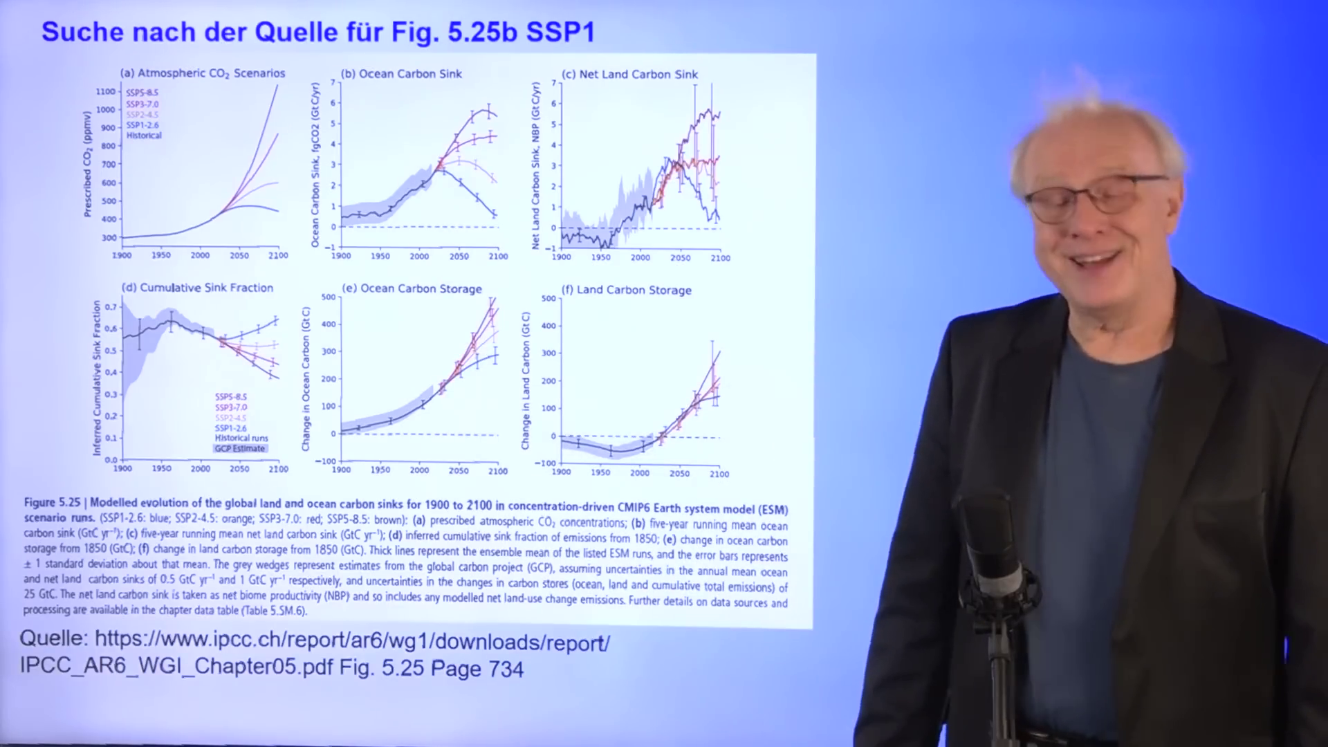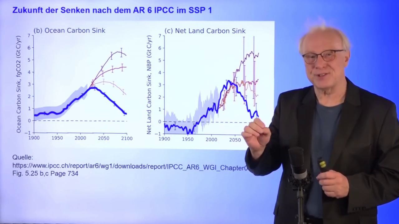 Der IPCC zeigt in seiner Graphik 5.25, dass die Senkenleistung bis 2100 stark abfällt, wenn wir unsere Emissionen auf netto null reduzieren (blaues Szenario). Was sagt Ganteför dazu?