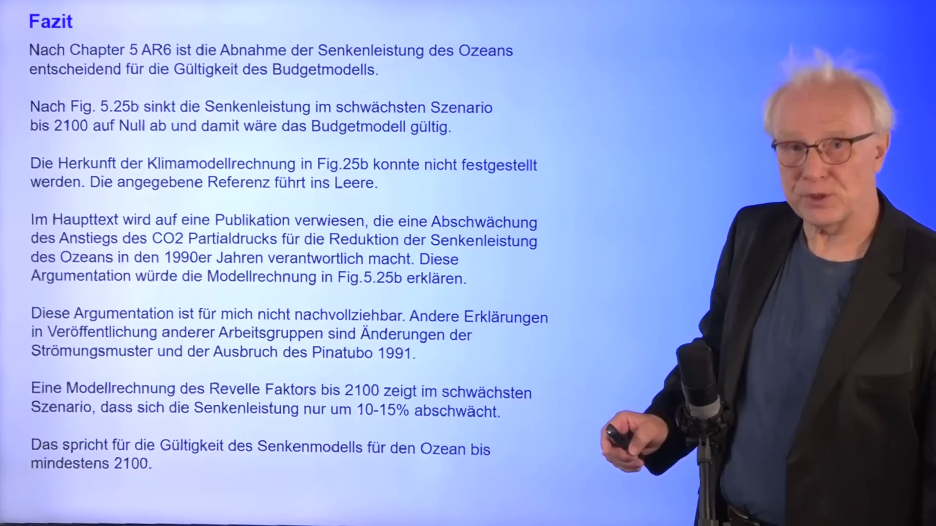 Über den Revelle Faktor könnte man ein eigenes Video machen - vielleicht macht das Prof. Ganteför ja noch. Wichtig ist hier erstmal, dass je höher der Revelle Faktor ist, desto schlechter kann der Ozean überhaupt CO2 aufnehmen. Wie viel er dann wirklich jährlich aufnimmt, also wie hoch die Senkenleistung ist, hängt neben dem Revelle Faktor aber noch von den Partialdrücken ab. Sehen wir einmal, was Prof. Ganteför sagt.